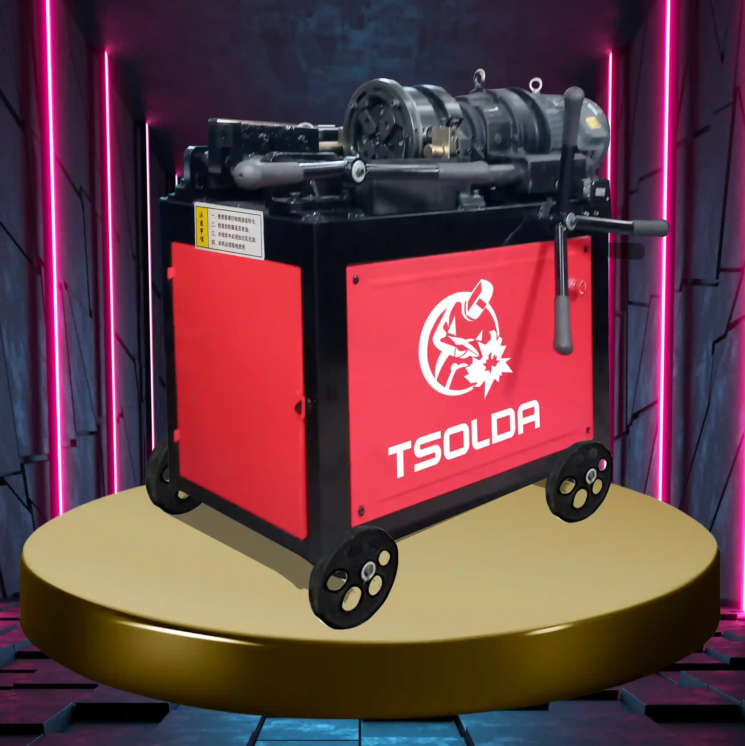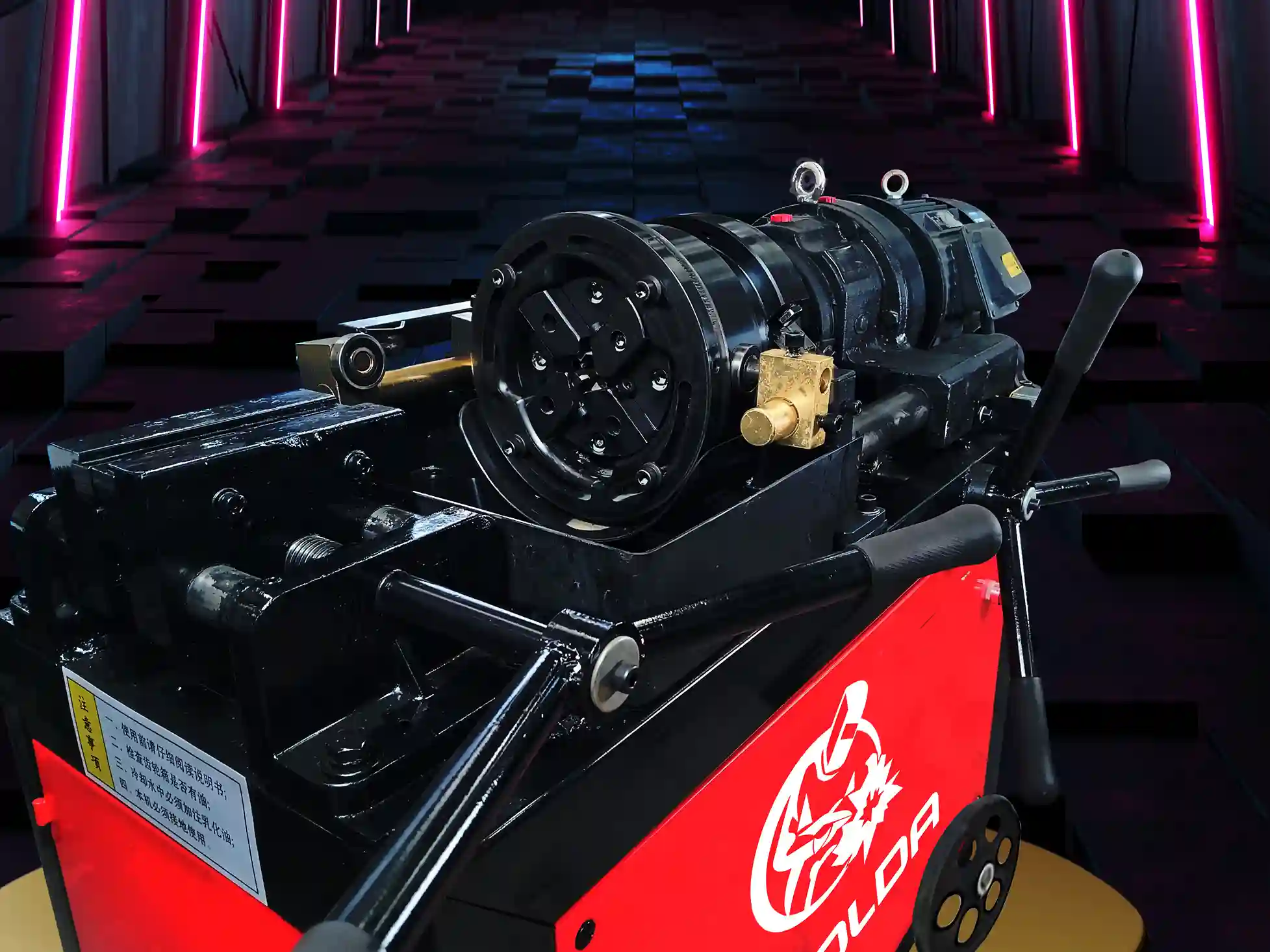 Máquina roscadora de barras o varillas corrugadas de 5 a 73 mm de diámetro con una longitud de roscado de 8 cm máximo, con un paso de hasta 6 mm. El equipo cuenta con mordaza de sujeción para evitar que el material se mueva al realizar el proceso, ya que al comenzar la operación, el material pasa por cuchillas que realizan la reducción del material y enseguida pasa por rodillos encargados de crear la rosca.