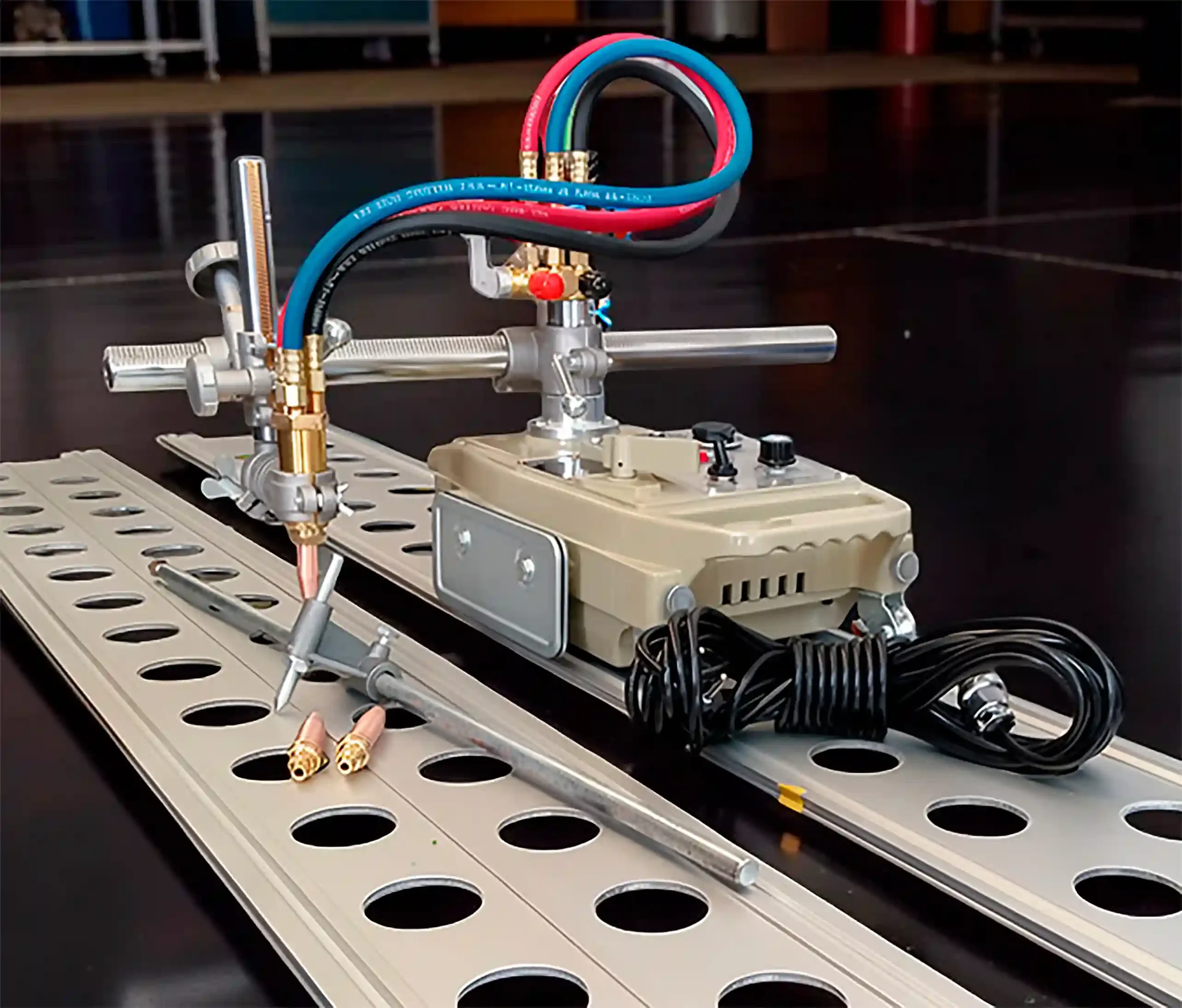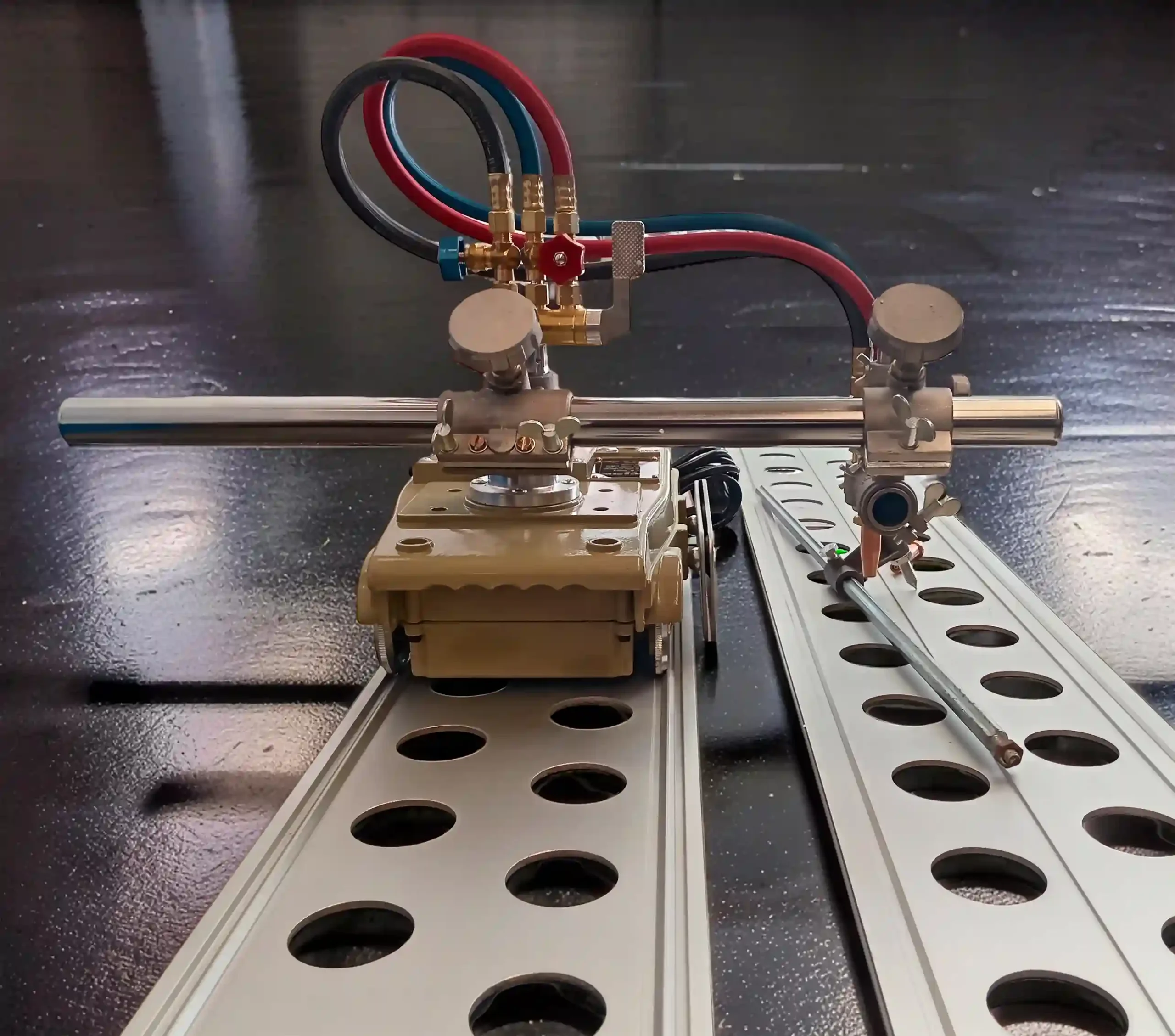 Tortuga para oxicorte de una sola antorcha, sirve tanto para cortes rectos como para cortes circulares. Estructura robusta y resistente para uso industrial. También se le puede colocar una antorcha para corte con plasma. Cuenta con controlador de velocidad de corte, y dos rieles de 1.8m para el desplazamiento de la tortuga.